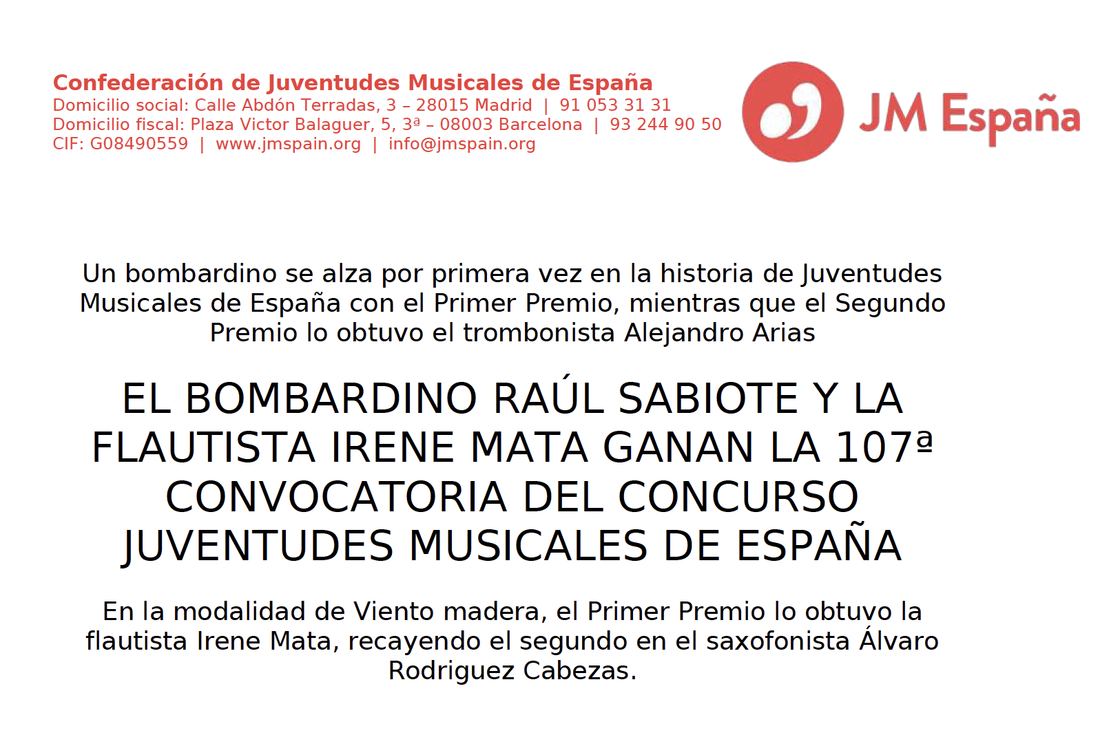 El almeriense se convierte en el primer bombardinista en ganar el concurso Juventudes Musicales. Noticia recuperada de La Voz de Almería El músico almeriense Raúl Sabiote, se ha alzado como ganador, en la categoría de viento metal, de la prestigiosa competiciónJuventudes Musicales de España (JM España) que tuvo lugar los pasados...