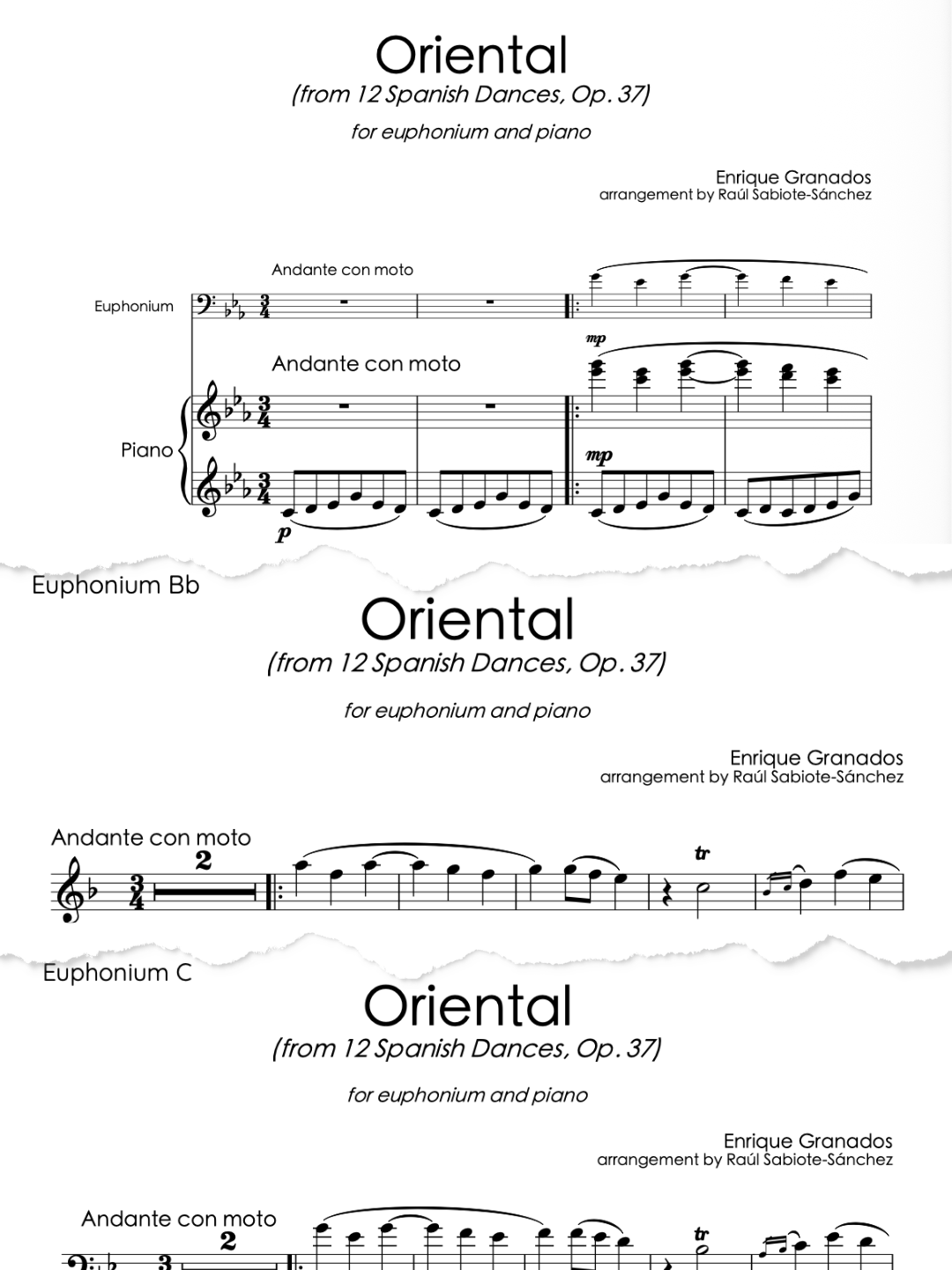 Compuesta originalmente para piano, Oriental ha sido arreglada y transcrita para diversas formaciones. En esta ocasión, se presenta en una versión para bombardino y piano, arreglada y revisada por Raúl Sabiote. Esta adaptación ha sido incluida en Reminiscencias (2025), el último álbum de Sabiote.